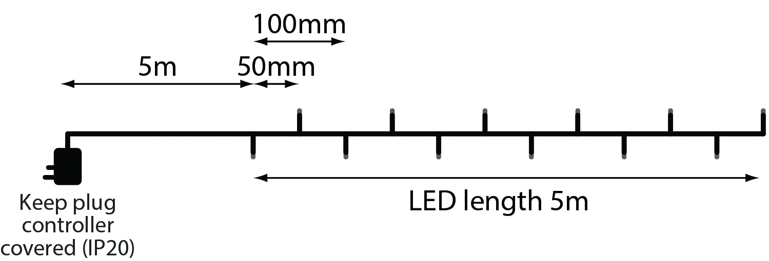 • Mains plug to first LED: 5m