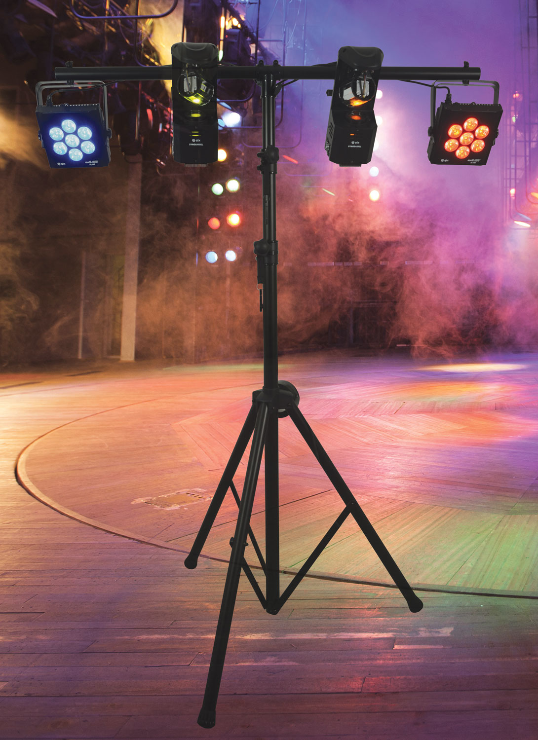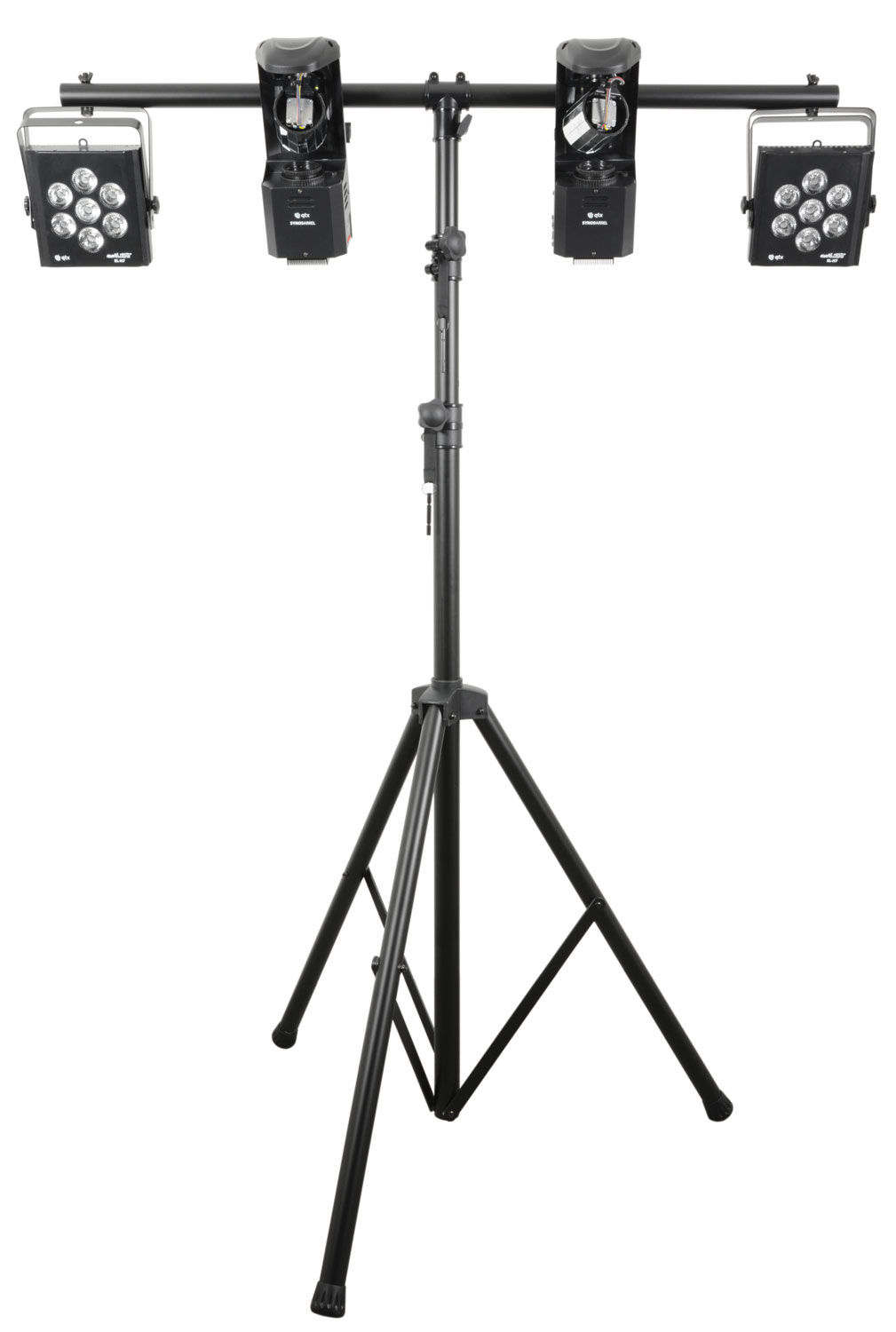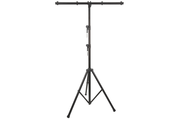 A robust black lighting stand on a foldable tripod with lockable height adjustment and safety pins.