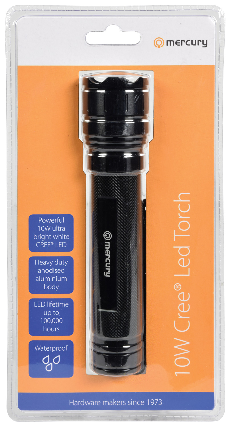 This professional heavy duty 10W CREE LED torch has an anodised black aluminium body with knurled grip. It features a high intensity adjustable light beam making it ideal for a wide range of outdoor and indoor activities.