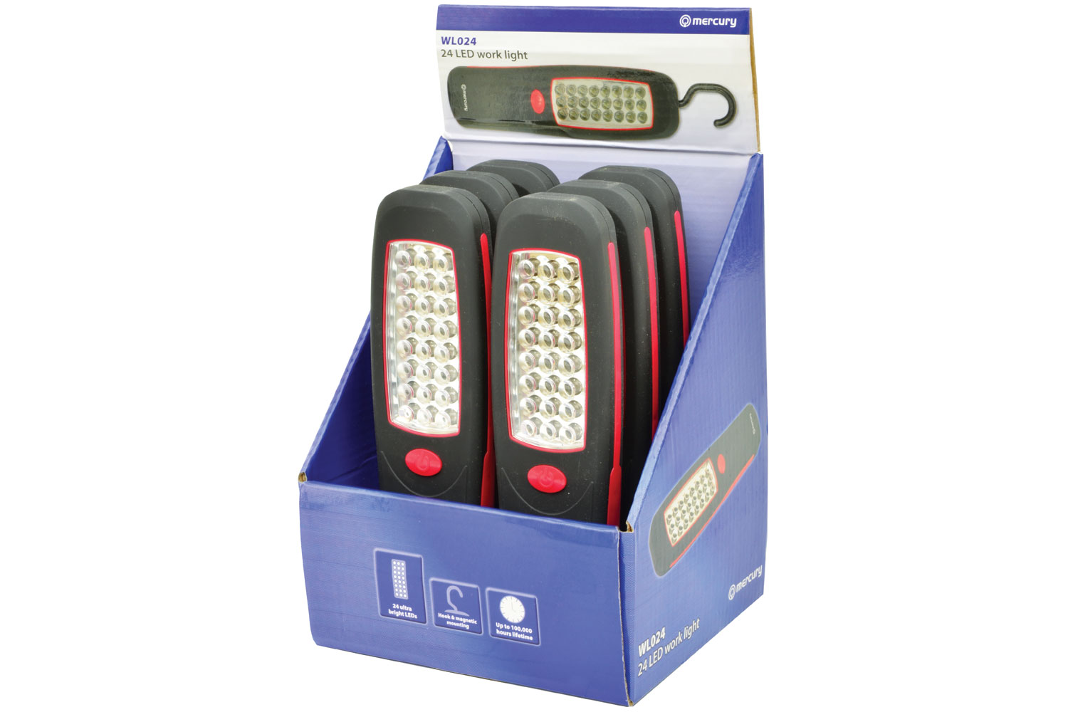 Battery powered ultra-bright 24 LED work light that can be either hung with the foldable hook or attached to a magnetic surface.