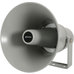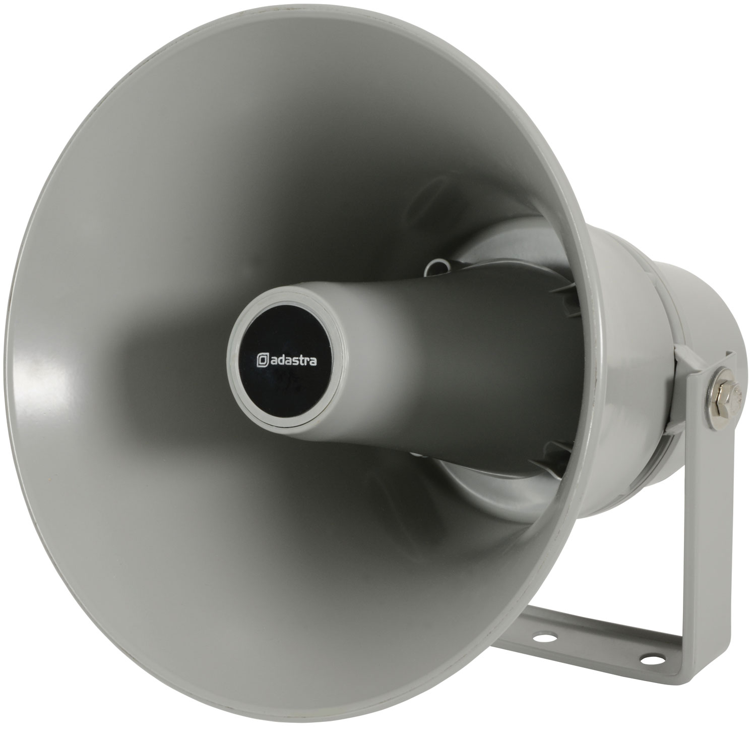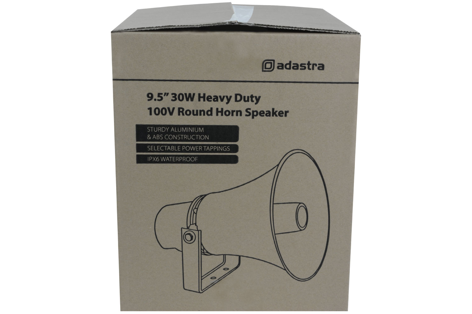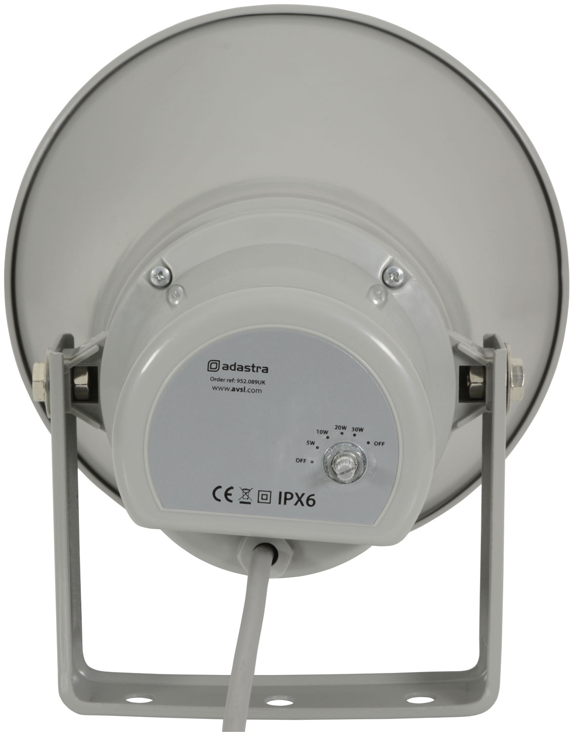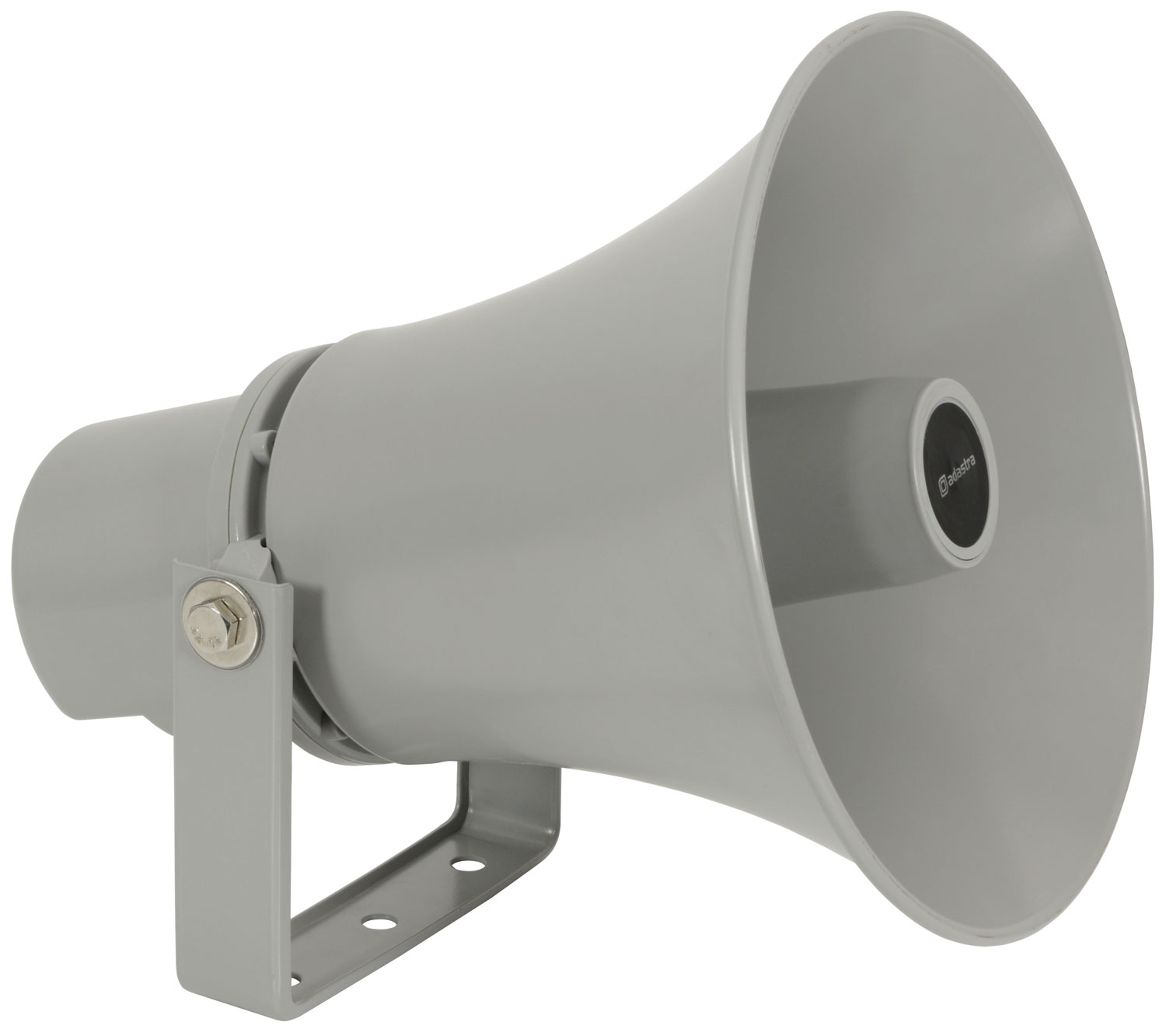 Heavy duty round PA horn speakers with a fibreglass compression driver and 100V transformer with a weatherproof ABS cover and reflex cone. Sound is projected from a spun aluminium flare which is angle adjustable on the mounting bracket. Power tappings are selected via a rotary switch at the rear with a 2-core cable for connection to a 100V amplifier. Built to withstand the elements and designed to deliver information and alerts in public outdoor areas.